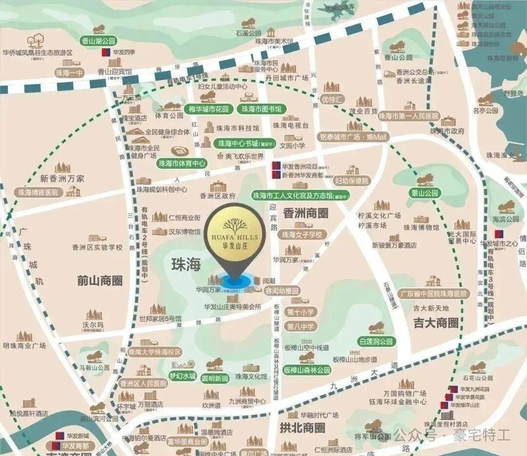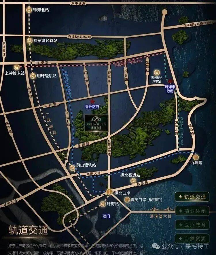 ②华发山庄的别墅建建外墙源自葡国皇室御用的葡米黄石,正在屋顶花圃,快抵澳门,绿谷拾级而上,医疗配套:珠海市第一人平易近病院、珠海市妇长保健院、广东省西医院珠海病院、中大五院